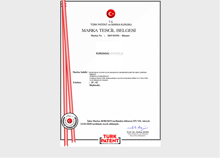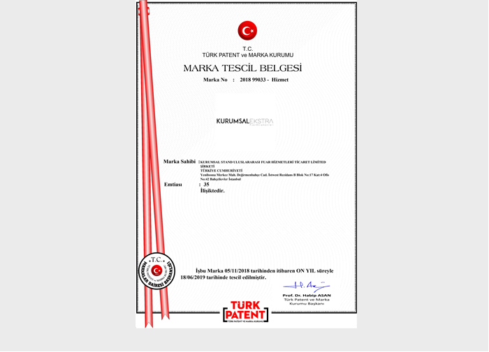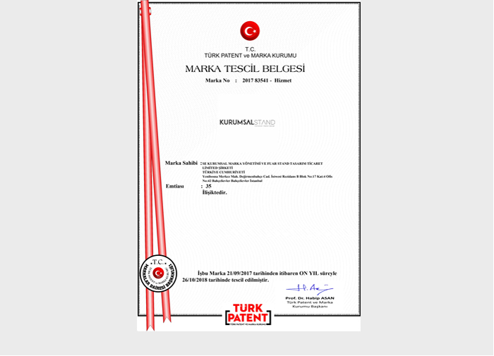 KURUMSAL STAND ULUSLARARASI FUAR HİZ.TİC.LTD.ŞTİ olarak 21.09.2017 tarihinde Türk Patent Kurumundan almış olduğumuz tescil markamızdır...